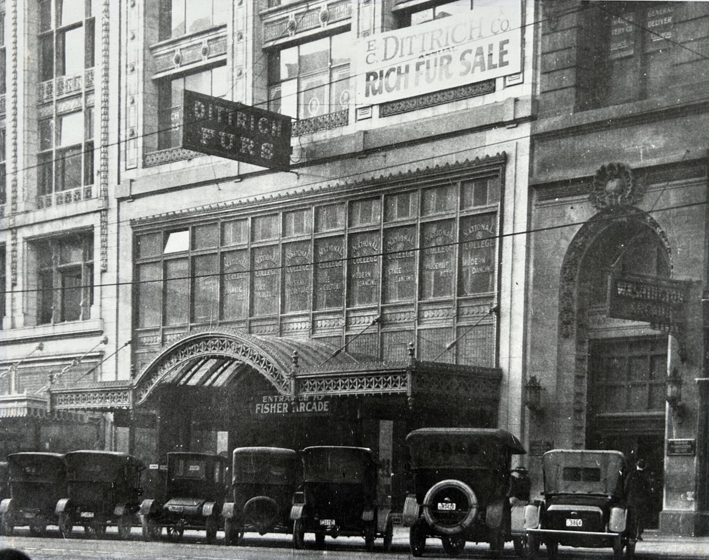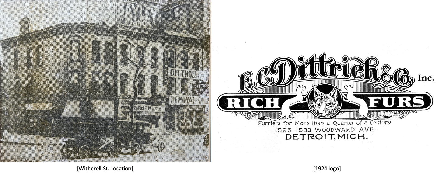 After World War I, Dittrich Furs outgrew its original location and moved to the Fisher Arcade on Woodward Avenue. Emil and his three sons, Francis, Harold E. and Alfred operated the business at this location until it moved to its third location at 2341 Grand River in 1928.